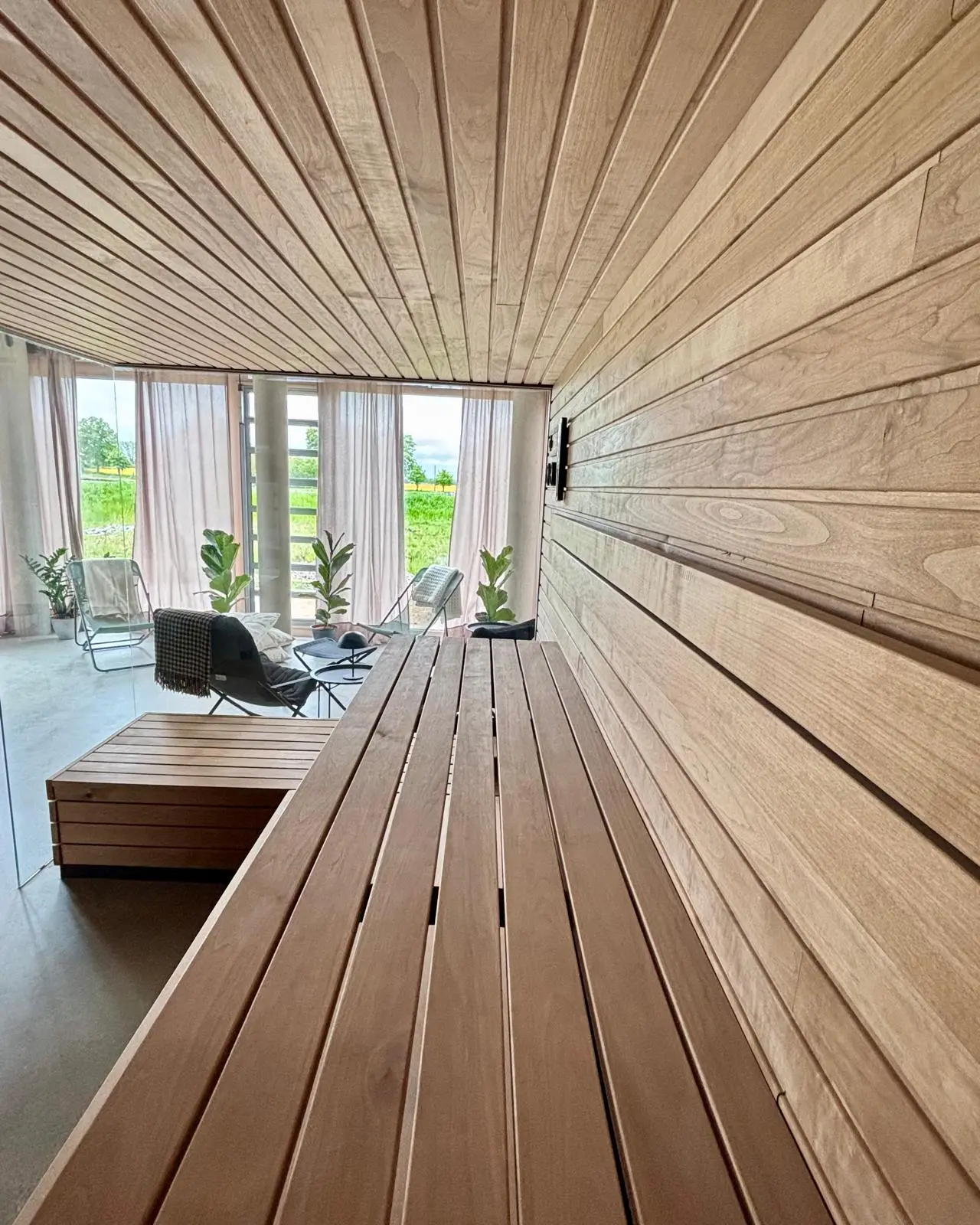 Die Sauna mit Panoramablick in den Garten erwärmt nicht nur im Winter Körper und Seele. Sie verfügt über eine Außenterrasse, einen Ruheraum mit Massagemöglichkeit, eine Dusche, und ein separates WC.